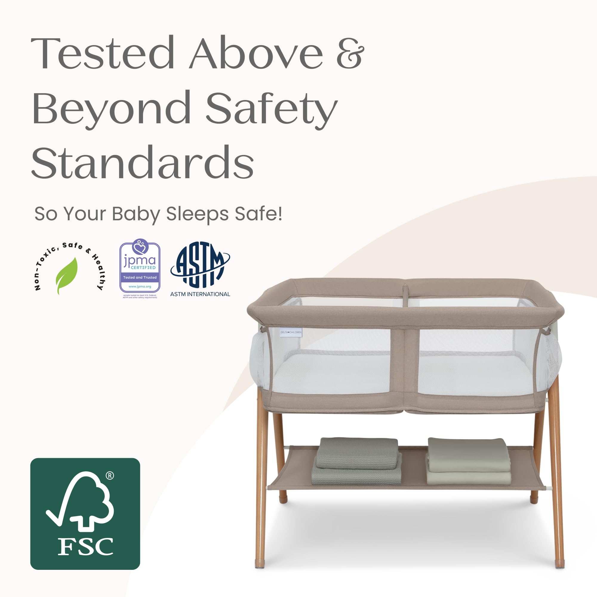 - SAFE CHOICE: This bassinet JPMA certified to meet or exceed all safety standards set by the CPSC & ASTM | Non-skid feet keep the bassinet securely in place | Assembled dimensions: 34.5”L x 35.5”W x 30.5”H | Product weight: 22.9 lbs. | Bassinet includes 2 water-resistant mattress pads and 2 breathable fitted sheets
