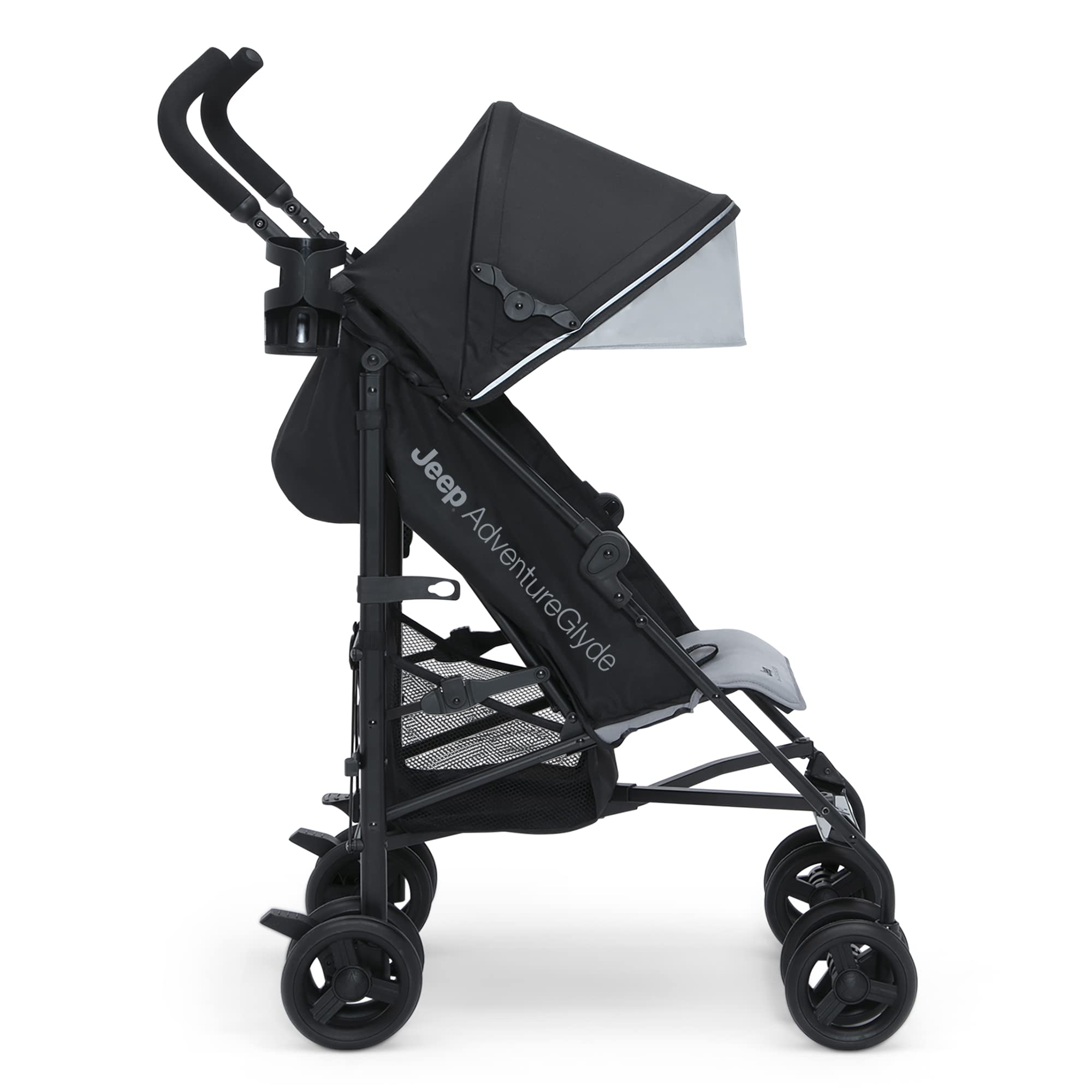 Jeep AdventureGlyde Stroller by Delta Children - Lightweight Travel Stroller with Smoothest Ride & Compact Fold, 3-Position Recline, Extra Large Storage Basket, Black/Grey