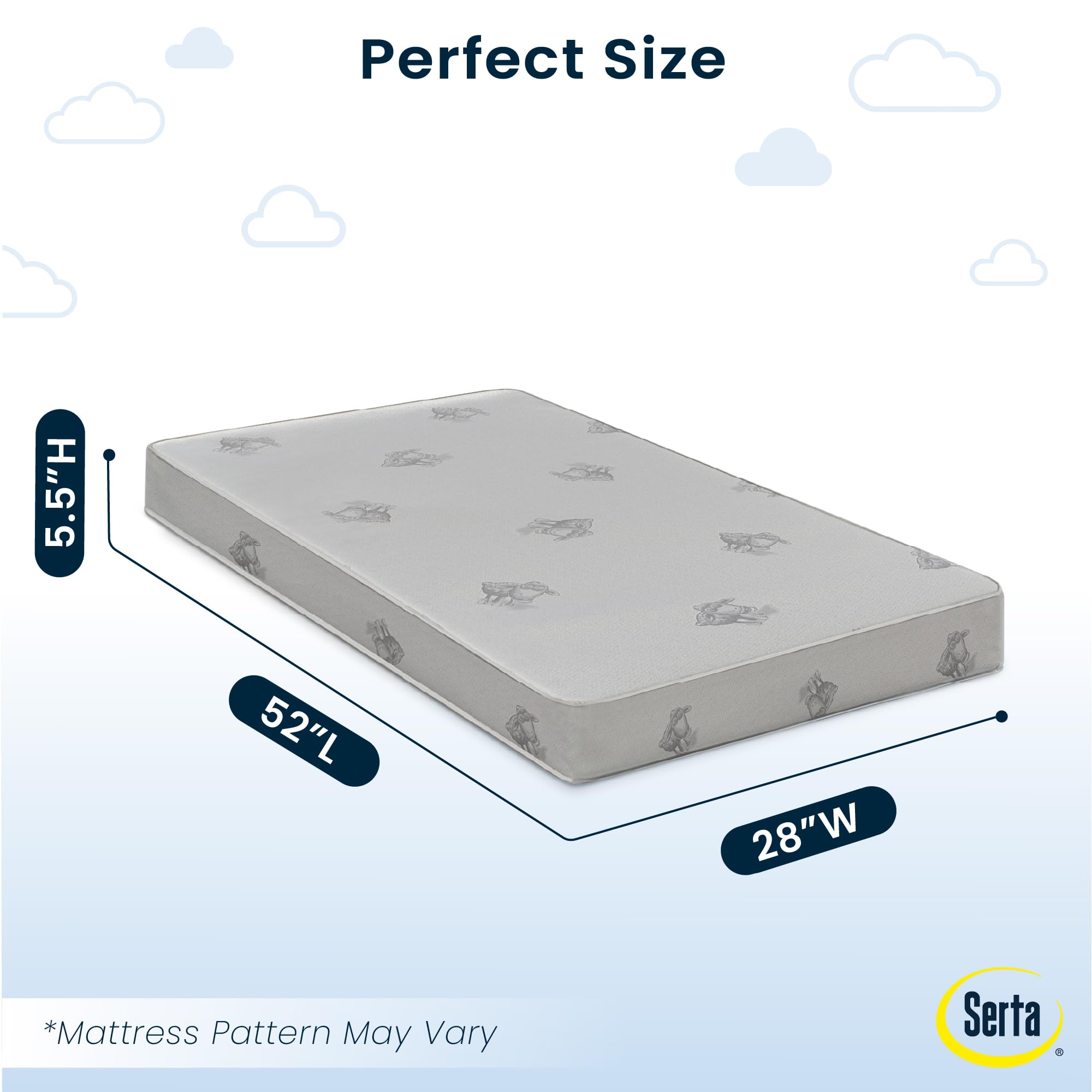 - MORE IMPORTANT INFO: Mattress comes with limited 7-year warranty | 52"L x 28" W x 5.5"H | Fits most standard full-size cribs or toddler beds | Waterproof |Non-toxic construction for a healthy sleep environment